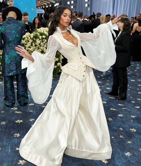 disclaimer: it’s feels really stupid to write and care about the met gala right now. i feel a need to justify my care, which is even more stupid. the 1% gather- unsure how to approach a theme with black people at its center in a political climate where no one wants to be taken out of context. all while protestors were harassed down the block for refusing to comply with the ongoing funding of a genocide. putting any weight on celebrities paying thousands of dollars for a ticket to party is trivial. i almost feel guilty to engage in conversations about the event. and in that same vein, the event is a tribute to an art form i feel so deeply for. why not evaluate the art of styling and costume? i debrief with the tail between my legs.