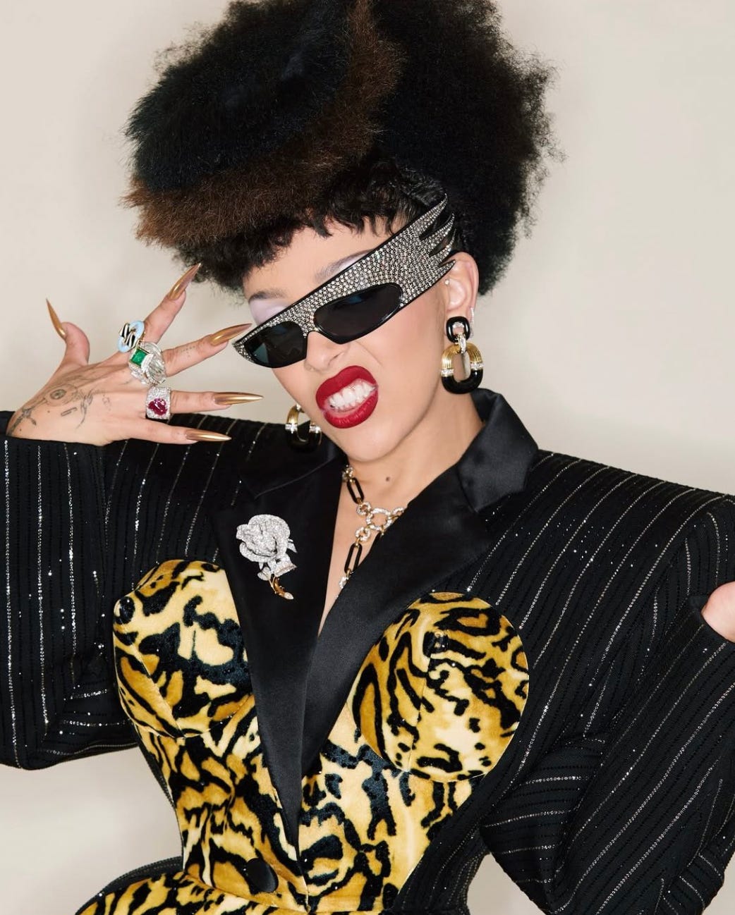 i submit my MVP of the evening. known for taking fashion risks, i really fuck with the eighties route doja cat took; capturing how black dandyism looked different in a time outside the early 20th century. here, she takes inspiration from grace jones; whose vibe dominated the 1970s and 80s scenes of art, music, and beauty. the sharp lines, exaggerated silhouette, bold print contrasting with the glittered lines of the jacket… it’s all so scrumptious to me.
